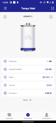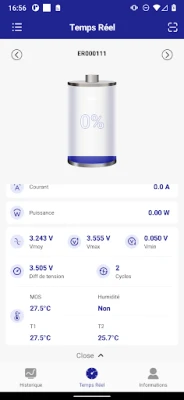 3) Affichage des informations détaillées sur le fonctionnement de la batterie dans l'onglet "Temps Réel", y compris : le pourcentage d'état de charge, la tension, le courant, la température de la batterie, etc.