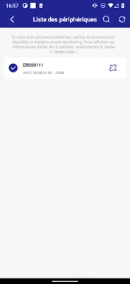 2) L’application détecte et répertorie votre/vos batterie(s) à distance. Retrouvez et connectez/déconnectez-vous à vos batteries en les recherchant dans l’onglet « Liste des périphériques »
