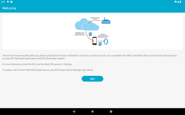 nRF Device Firmware Update is a mobile app for updating nRF5 SDK firmware using Bluetooth Low Energy as a transport. It can update the firmware of nRF51 or nRF52 Series SoCs having an nRF5 SDK Secure Bootloader (v12.0.0 or newer) or an nRF5 SDK legacy bootloader (v4.3.0-11.0.0).