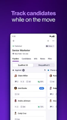 Use the Tellent Recruitee mobile app to: - Manage your to-do list with notifications for your upcoming and outstanding tasks - Follow your candidates' progress with pipeline overviews, evaluations, and team notes - Communicate with candidates by mailbox, their profile contact info, or one-click interviews