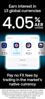 - High interest on your uninvested cash: 4.05% on GBP, 2.2% on EUR, 4.1% on USD, and more. Paid daily. Terms apply.
